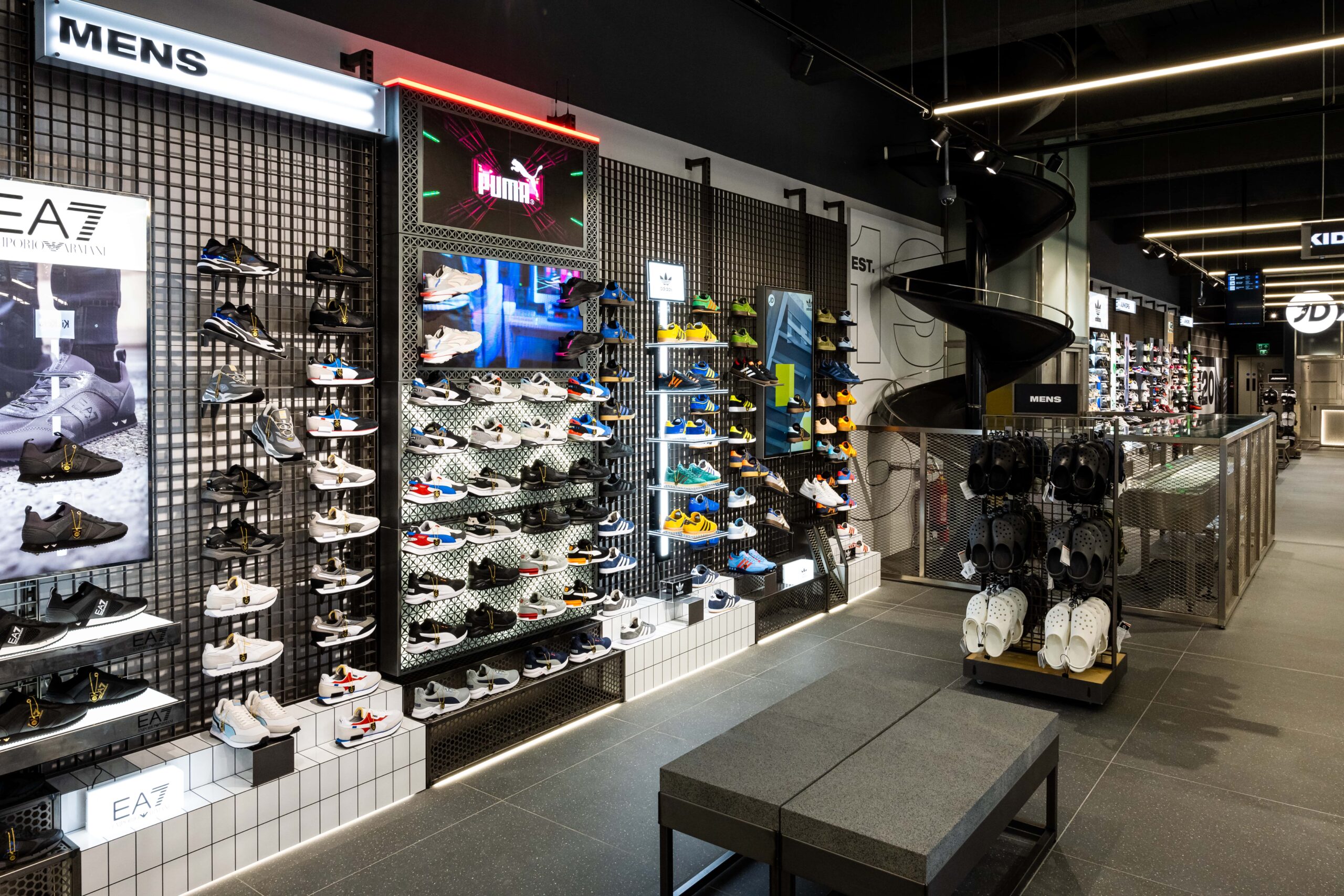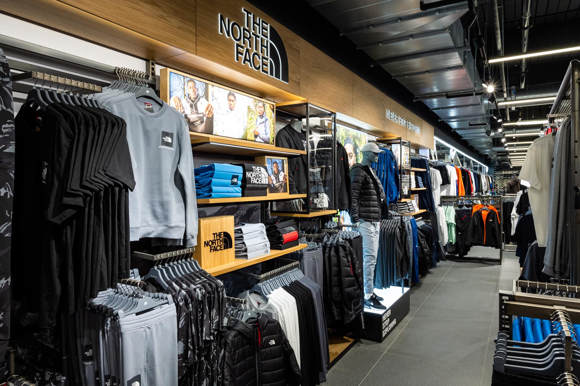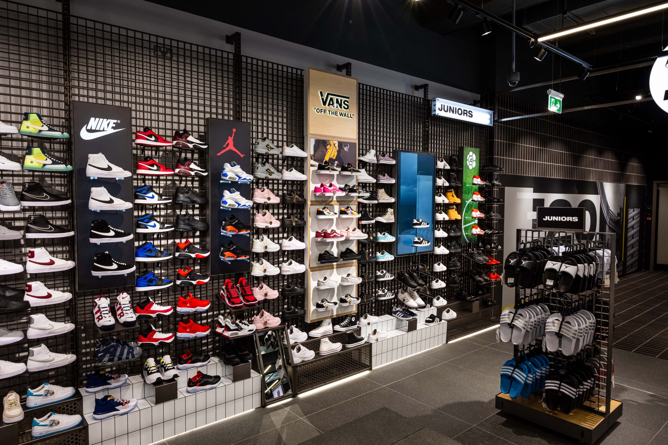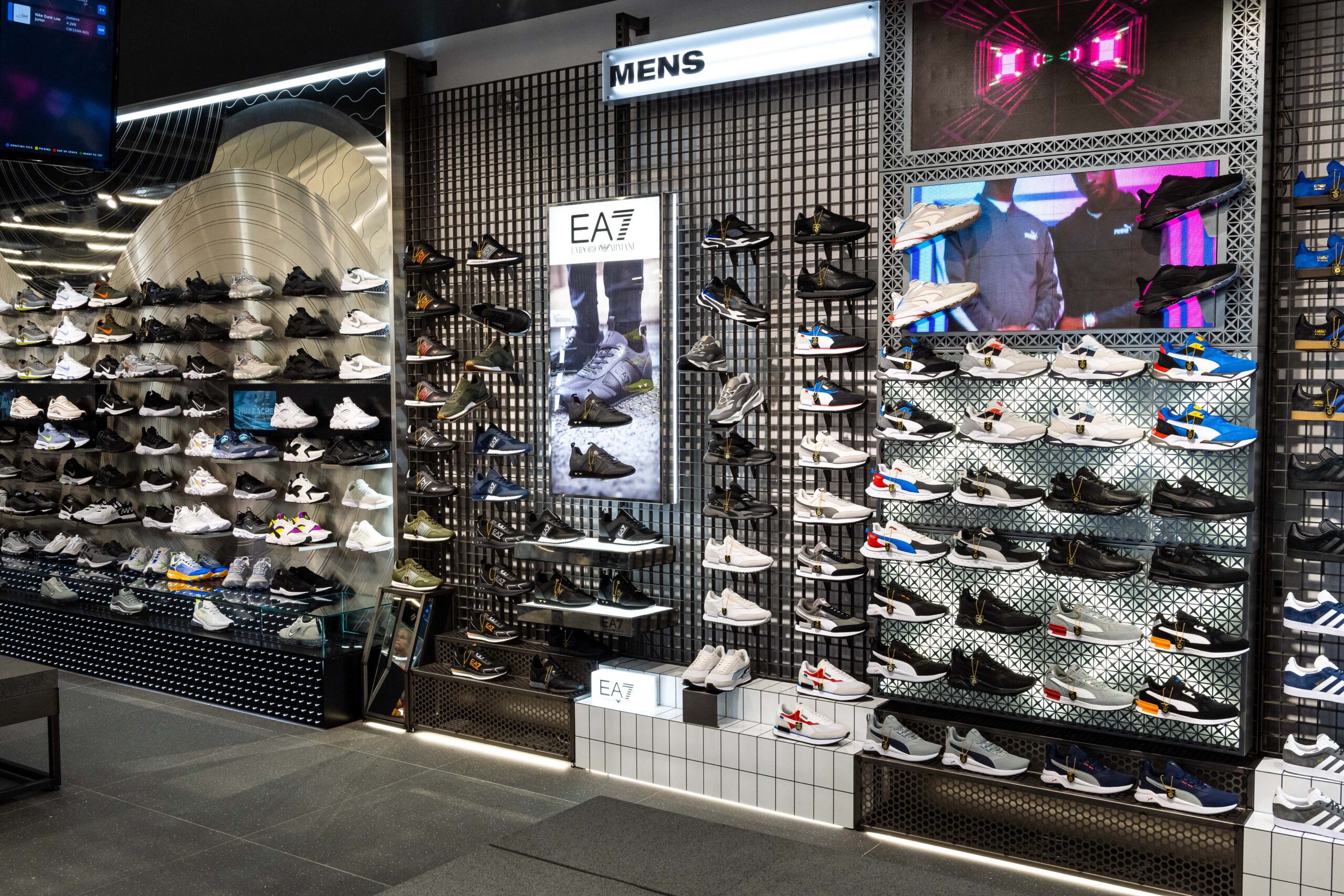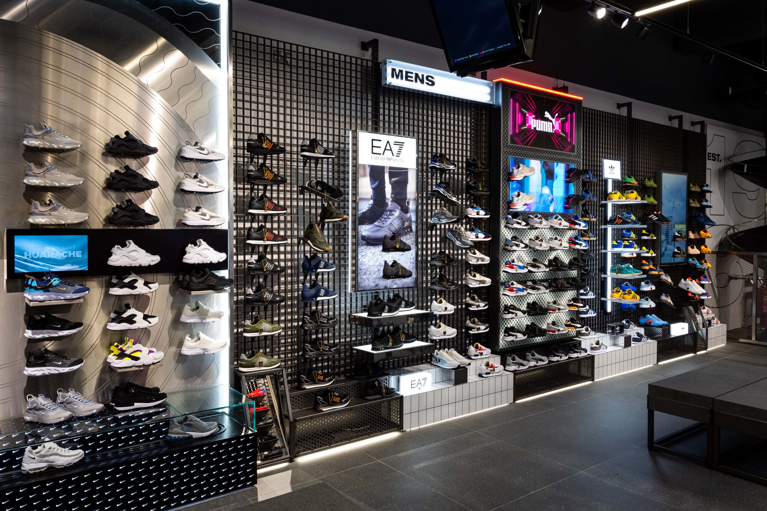 Bringing a sense of exploration to the shopping journey through its ticker-tape signage and futuristic-style screens displaying cinematic media, this ultramodern store concept is one of adventure and discovery. Making up its bold, statement design is a series of branded zones, many of which d4r had the pleasure of being involved with – whether it was designing a footwear wall, developing an apparel wall bay, or implementing a midfloor cage.