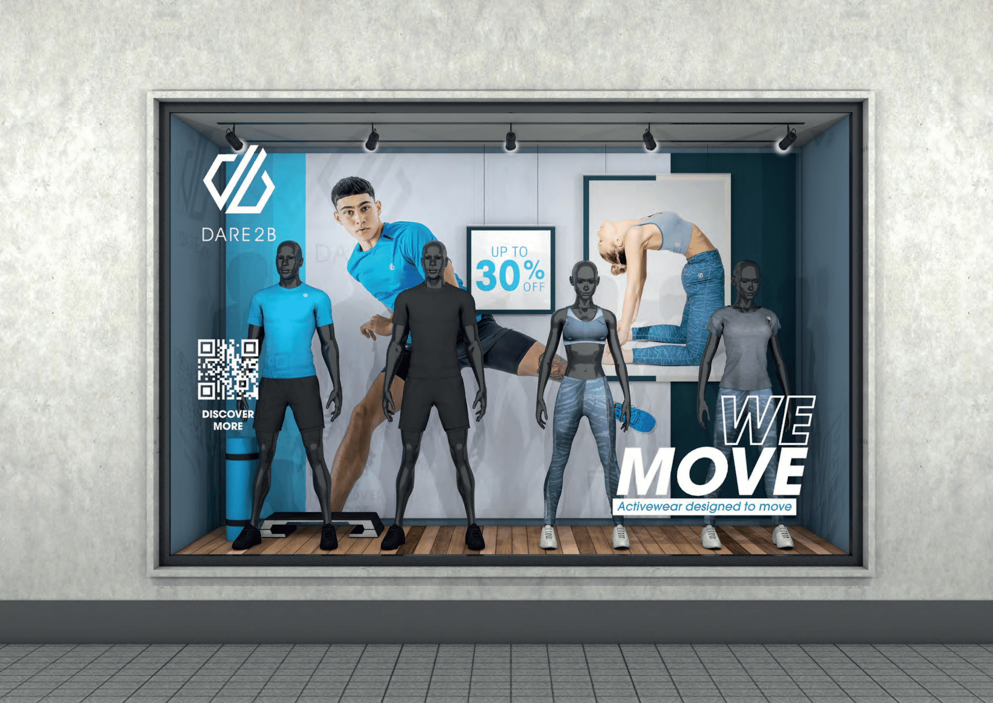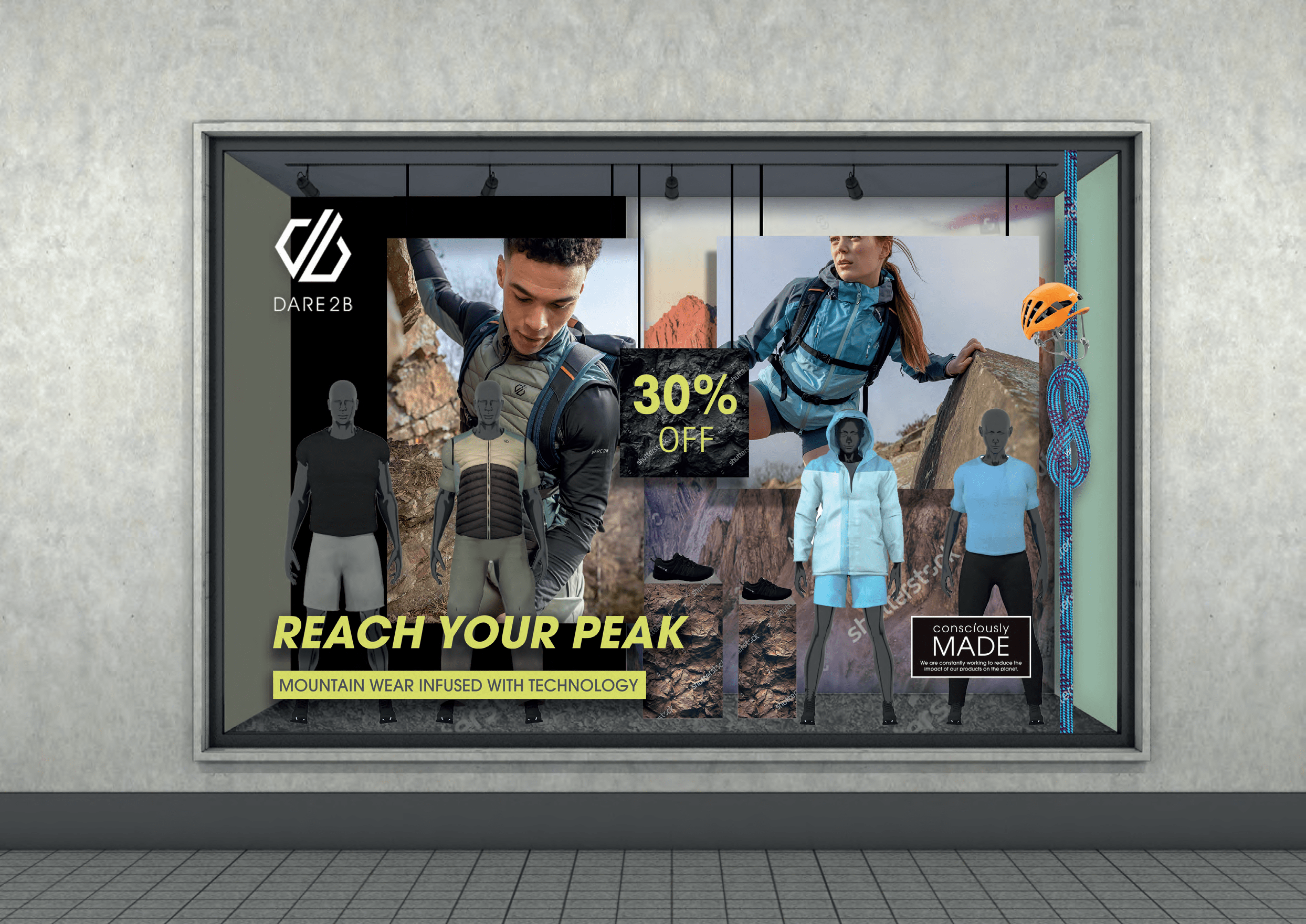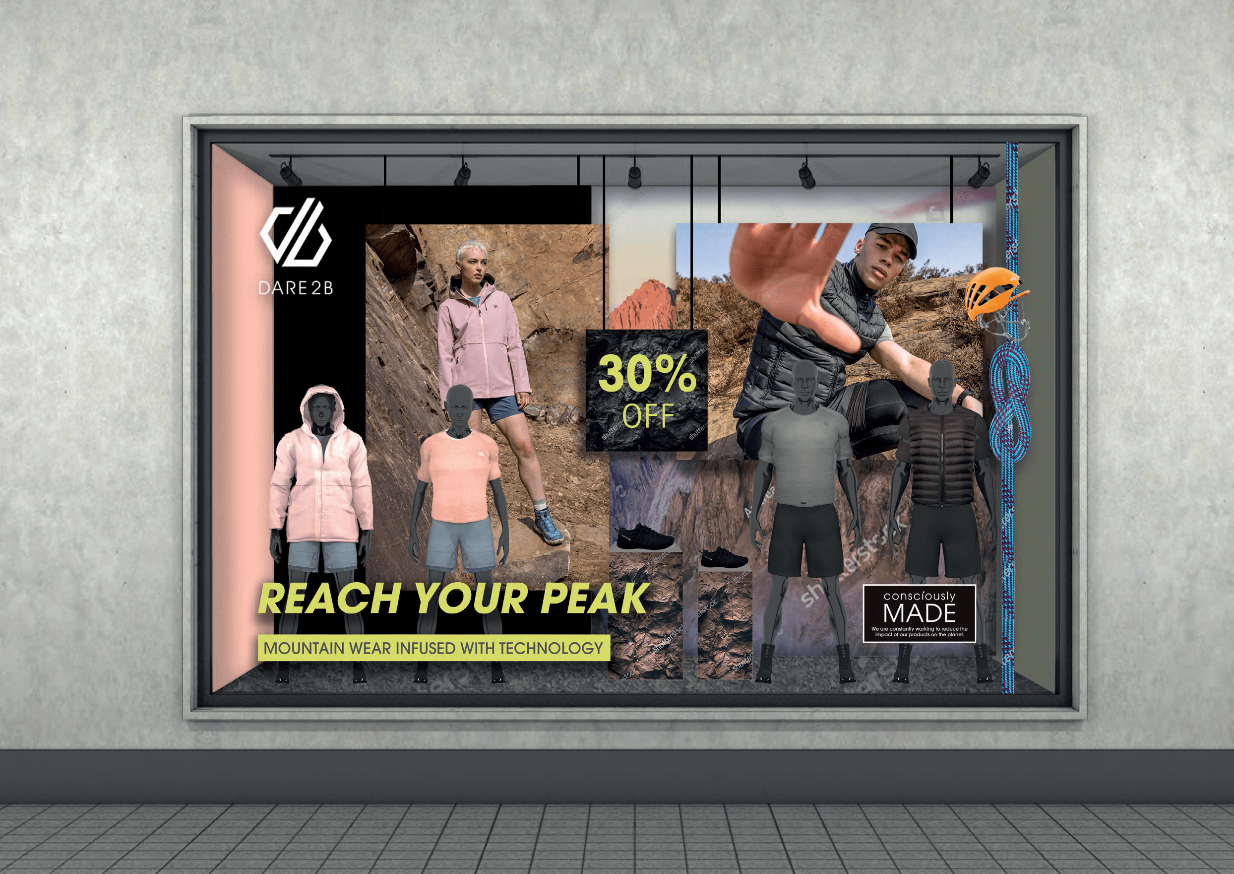 Using existing campaign assets, Dare 2b challenged us to translate the digital campaigns into three creative concepts that could be readily applied to select windows across Europe. Our studio combined colour palettes, visuals, and campaign copy to design a series of visually striking windows that exhibit a strength and energy reflective of the premium outdoor and active wear brand.