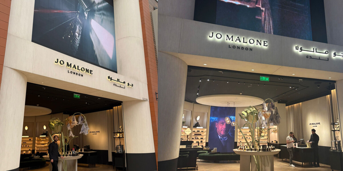 The Jo Malone London storefront presents a refined and elegant entrance, framed by towering, gently curved columns that introduce a sense of grandeur while maintaining a minimalist aesthetic. The facade’s subtle texture and soft, neutral tones create a calm and inviting atmosphere, perfectly complementing the brand’s understated luxury. Above the entrance, a large digital screen commands attention with evocative imagery that adds a dynamic, contemporary edge, hinting at the sensory journey awaiting inside.