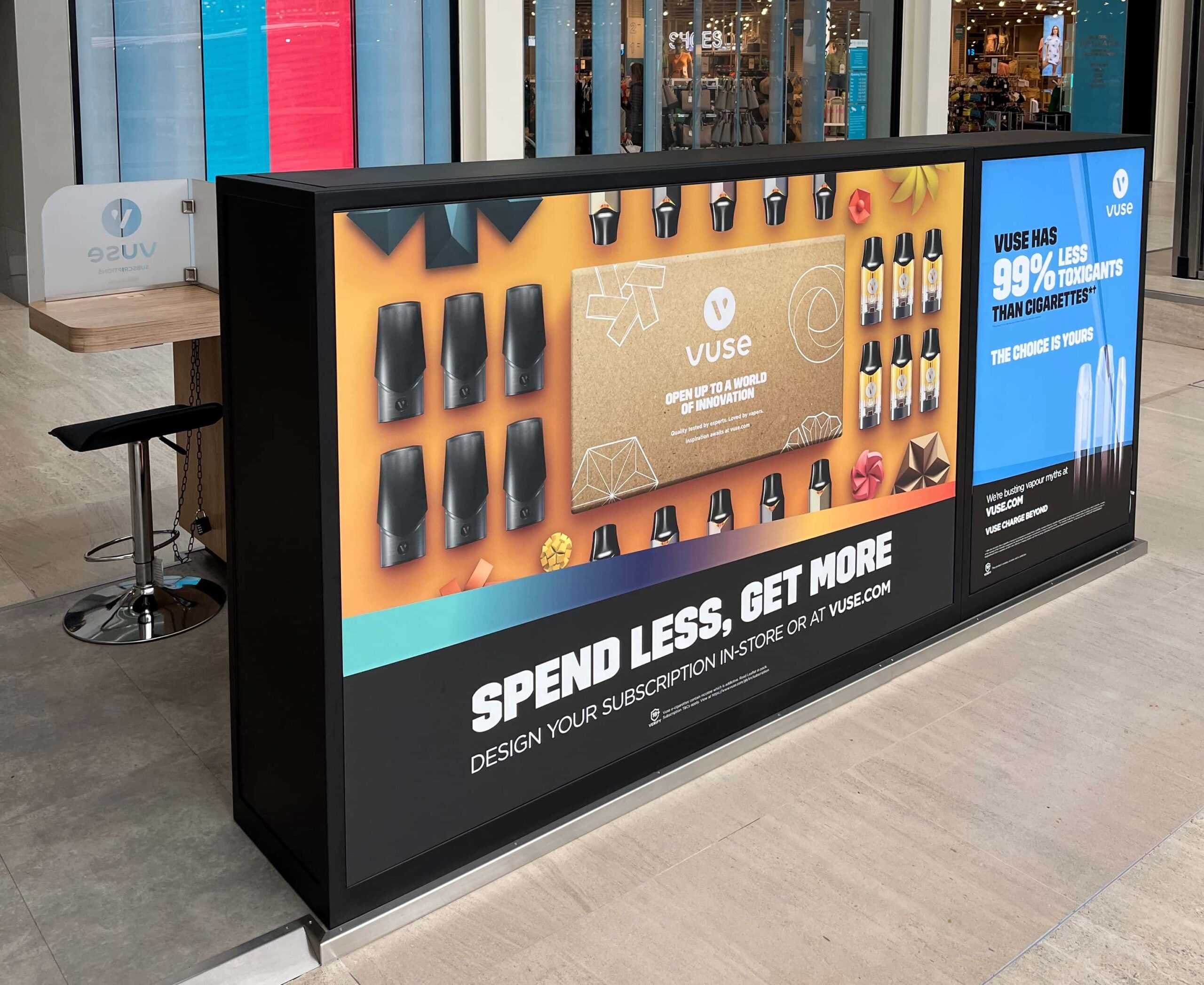Bringing the VUSE brand to shopping centres up and down the country, these impactful kiosks reveal an updated creative concept complementing the brand’s versatile aesthetic. Our creative contribution saw the implementation of a harmonious material palette of oak veneer, powder coated steel and concrete effect cladding, along with a selection of functional, decorative, and POS elements – from digital touchscreens and frosted glass with subscription branding, to an angled showcase and a large magnetic take-over graphic!