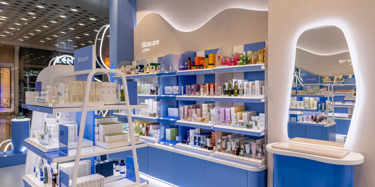 The store design utilises a soft palette of blue tones, soft whites, and warm nudes, contrasted with whimsical details like cloud-inspired curved tabletops and ambient lighting. Crucially, every fixture incorporates a “free-dress” approach, ensuring the store remains highly adaptable and future-ready for showcasing fluctuating stock, trending products, and new brand launches. This immersive, flexible, and cohesive design successfully elevates the physical retail experience, providing pureseoul with a powerful and scalable platform for future growth.