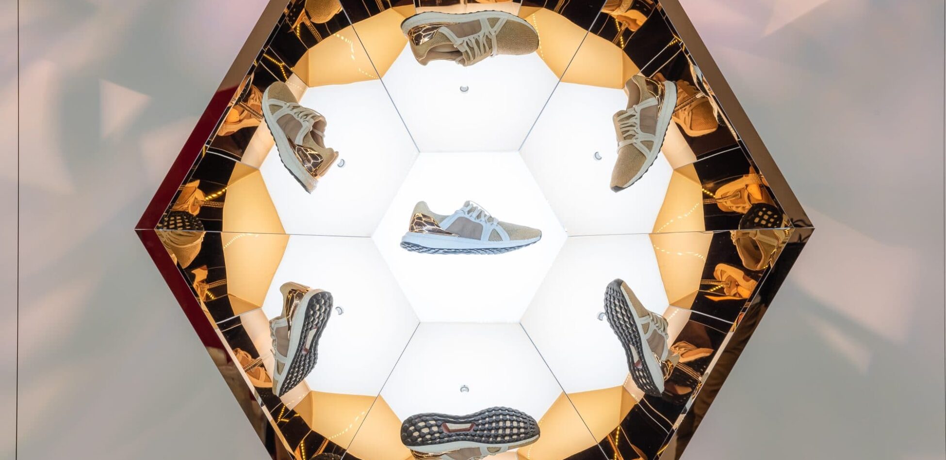 Radiating brilliance, the display captivated passersby, its luminous presence impossible to ignore. A refractive illusion paired with softly shifting lighting created a hypnotic effect, guiding the viewerās gaze directly to the centrepiece: the elegant, golden Ultraboost shoe.